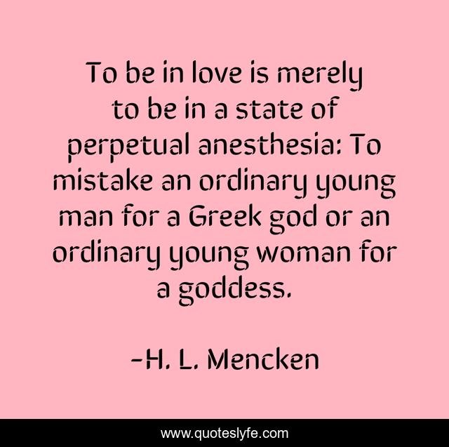 This page presents the quote "To be in love is merely to be in a state of perpetual anesthesia: To mistake an ordinary young man for a Greek god or an ordinary young woman for a goddess.". Author of this quote is H. L. Mencken. .