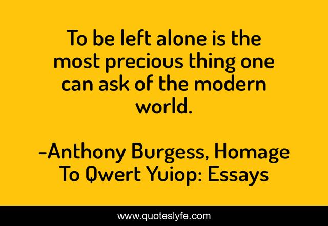 This page presents the quote "To be left alone is the most precious thing one can ask of the modern world.". Author of this quote is Anthony Burgess, Homage To Qwert Yuiop: Essays. This quote is about solitude, encroachment, privacy,.