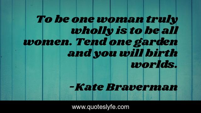 This page presents the quote "To be one woman truly wholly is to be all women. Tend one garden and you will birth worlds.". Author of this quote is Kate Braverman. This quote is about helping, people,.