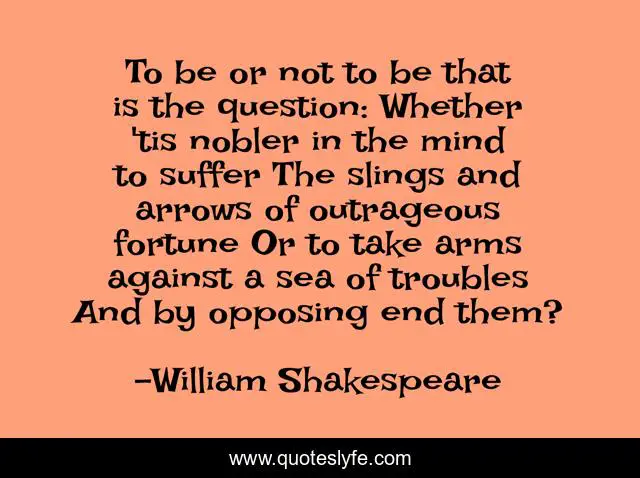 This page presents the quote "To be or not to be that is the question: Whether 'tis nobler in the mind to suffer The slings and arrows of outrageous fortune Or to take arms against a sea of troubles And by opposing end them?". Author of this quote is William Shakespeare. .