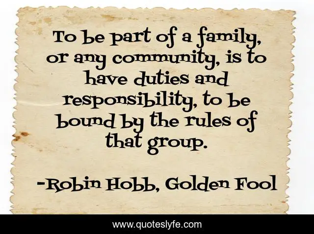 This page presents the quote "To be part of a family, or any community, is to have duties and responsibility, to be bound by the rules of that group.". Author of this quote is Robin Hobb, Golden Fool. This quote is about family, relationship, rules, community, socialism, responsibility, friendship, duties, bond,.