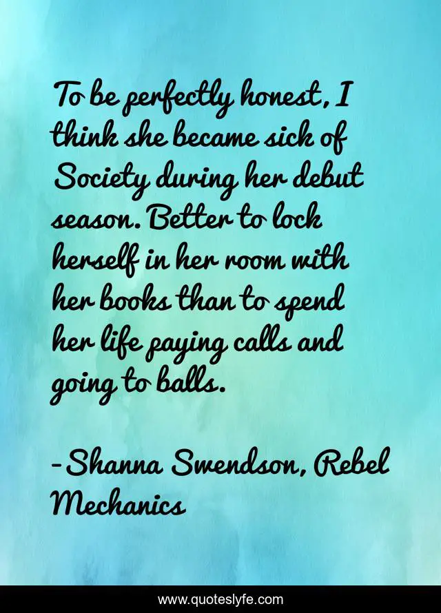 This page presents the quote "To be perfectly honest, I think she became sick of Society during her debut season. Better to lock herself in her room with her books than to spend her life paying calls and going to balls.". Author of this quote is Shanna Swendson, Rebel Mechanics. This quote is about society, anxiety, books, reading,.