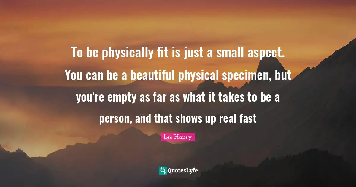 This page presents the quote "To be physically fit is just a small aspect. You can be a beautiful physical specimen, but you're empty as far as what it takes to be a person, and that shows up real fast". Author of this quote is Lee Haney. This quote is about physically fit, aspect, empty, fit, beautiful, real, shows,.