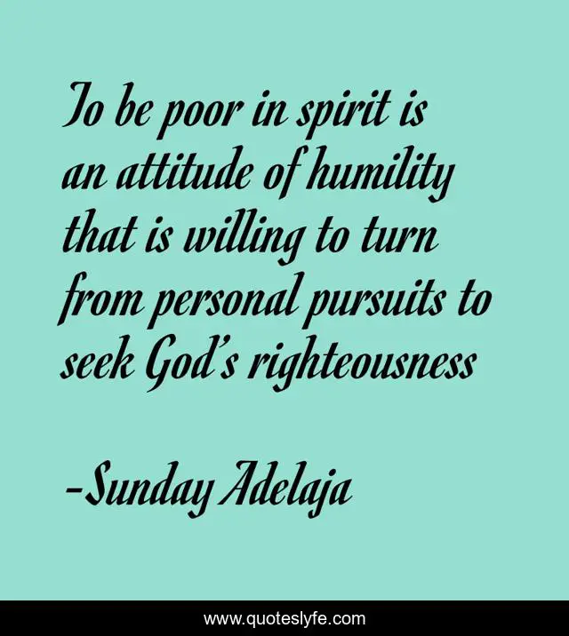 This page presents the quote "To be poor in spirit is an attitude of humility that is willing to turn from personal pursuits to seek God’s righteousness". Author of this quote is Sunday Adelaja. This quote is about poor, god, behaviour, attitude, humility, seek, spirit,.
