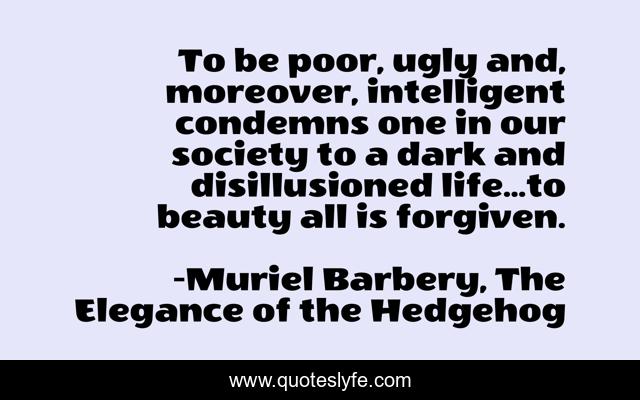 This page presents the quote "To be poor, ugly and, moreover, intelligent condemns one in our society to a dark and disillusioned life...to beauty all is forgiven.". Author of this quote is Muriel Barbery, The Elegance of the Hedgehog. .