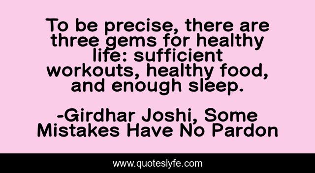 This page presents the quote "To be precise, there are three gems for healthy life: sufficient workouts, healthy food, and enough sleep.". Author of this quote is Girdhar Joshi, Some Mistakes Have No Pardon. This quote is about healthy-living, workout, sleep,.