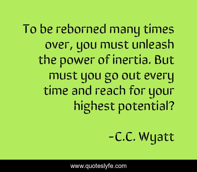 This page presents the quote "To be reborned many times over, you must unleash the power of inertia. But must you go out every time and reach for your highest potential?". Author of this quote is C.C. Wyatt. This quote is about inspirational-attitude, humor, humorist-extraordinaire,.
