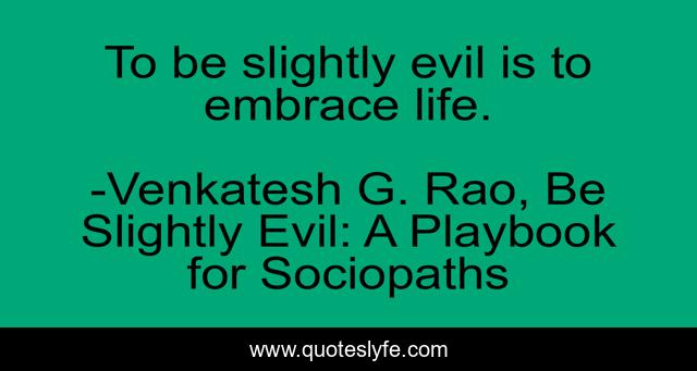 This page presents the quote "To be slightly evil is to embrace life.". Author of this quote is Venkatesh G. Rao, Be Slightly Evil: A Playbook for Sociopaths. This quote is about life-philosophy, life, evil,.