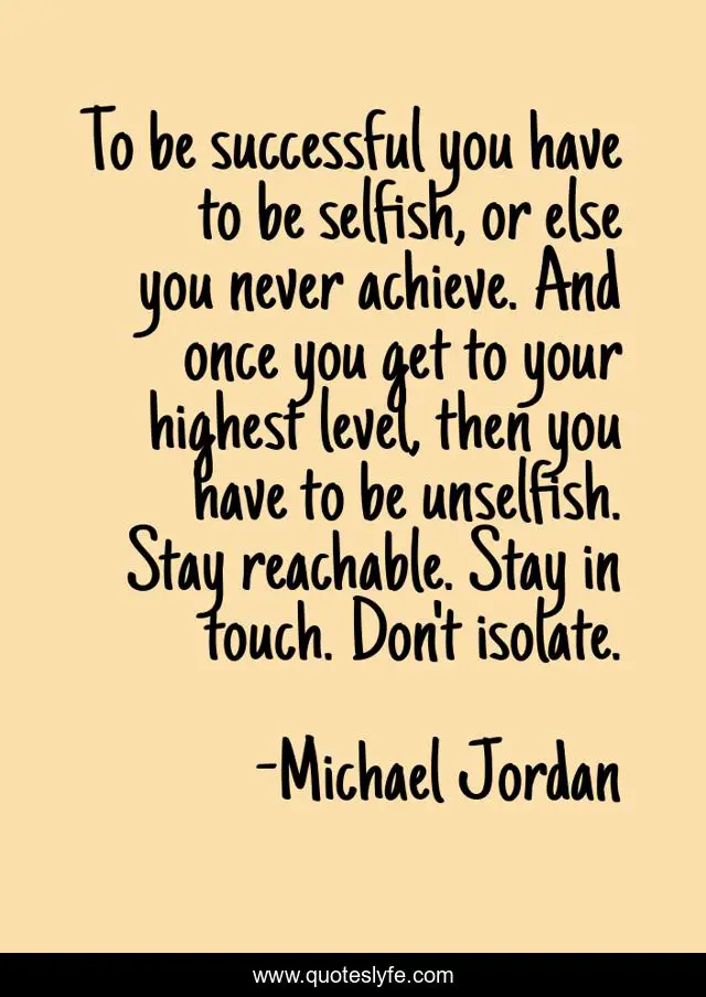 This page presents the quote "To be successful you have to be selfish, or else you never achieve. And once you get to your highest level, then you have to be unselfish. Stay reachable. Stay in touch. Don't isolate.". Author of this quote is Michael Jordan. This quote is about sporting-advice, basketball, excellence,.