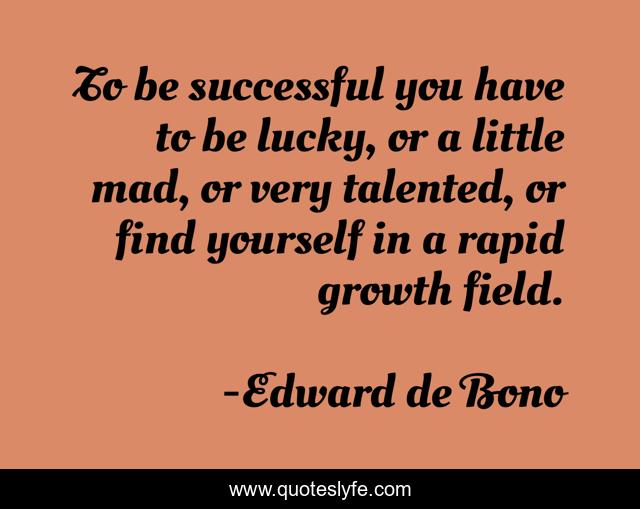This page presents the quote "To be successful you have to be lucky, or a little mad, or very talented, or find yourself in a rapid growth field.". Author of this quote is Edward de Bono. This quote is about successful, growth, yourself,.