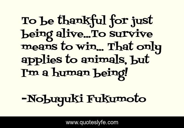 This page presents the quote "To be thankful for just being alive...To survive means to win... That only applies to animals, but I'm a human being!". Author of this quote is Nobuyuki Fukumoto. This quote is about life, strength, animals, survival, death, human,.