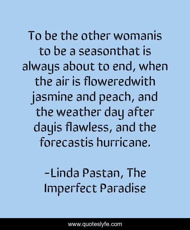 This page presents the quote "To be the other womanis to be a seasonthat is always about to end, when the air is floweredwith jasmine and peach, and the weather day after dayis flawless, and the forecastis hurricane.". Author of this quote is Linda Pastan, The Imperfect Paradise. This quote is about poetry, adultery,.