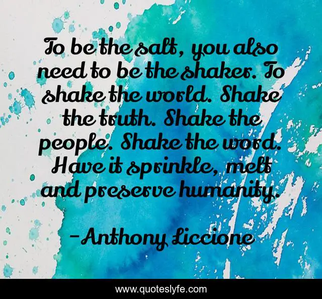 This page presents the quote "To be the salt, you also need to be the shaker. To shake the world. Shake the truth. Shake the people. Shake the word. Have it sprinkle, melt and preserve humanity.". Author of this quote is Anthony Liccione. This quote is about covenant, inspire, move, life, jesus, break-down, christ, motivate, cross,.