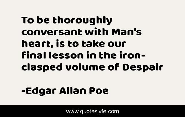 This page presents the quote "To be thoroughly conversant with Man’s heart, is to take our final lesson in the iron-clasped volume of Despair". Author of this quote is Edgar Allan Poe. .