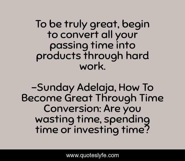 This page presents the quote "To be truly great, begin to convert all your passing time into products through hard work.". Author of this quote is Sunday Adelaja, How To Become Great Through Time Conversion: Are you wasting time, spending time or investing time?. This quote is about life, conversion, productivity, wealth, hard-work, greatness, waste, humanity, product,.