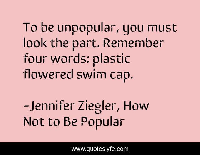This page presents the quote "To be unpopular, you must look the part. Remember four words: plastic flowered swim cap.". Author of this quote is Jennifer Ziegler, How Not to Be Popular. This quote is about unpopularity, funny, popularity, comedy,.