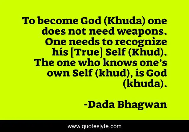 This page presents the quote "To become God (Khuda) one does not need weapons. One needs to recognize his [True] Self (Khud). The one who knows one’s own Self (khud), is God (khuda).". Author of this quote is Dada Bhagwan. This quote is about god, self, true, spiritual,.
