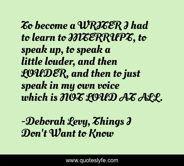 This page presents the quote "To become a WRITER I had to learn to INTERRUPT, to speak up, to speak a little louder, and then LOUDER, and then to just speak in my own voice which is NOT LOUD AT ALL.". Author of this quote is Deborah Levy, Things I Don't Want to Know. .