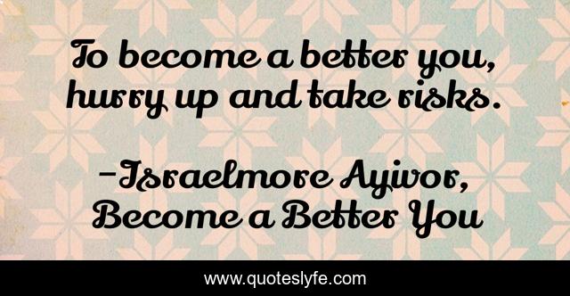 This page presents the quote "To become a better you, hurry up and take risks.". Author of this quote is Israelmore Ayivor, Become a Better You. This quote is about inspirations, personal-development, optimistic, risk-taking, food-for-thought, dare-to-be, positive, become-better, better,.