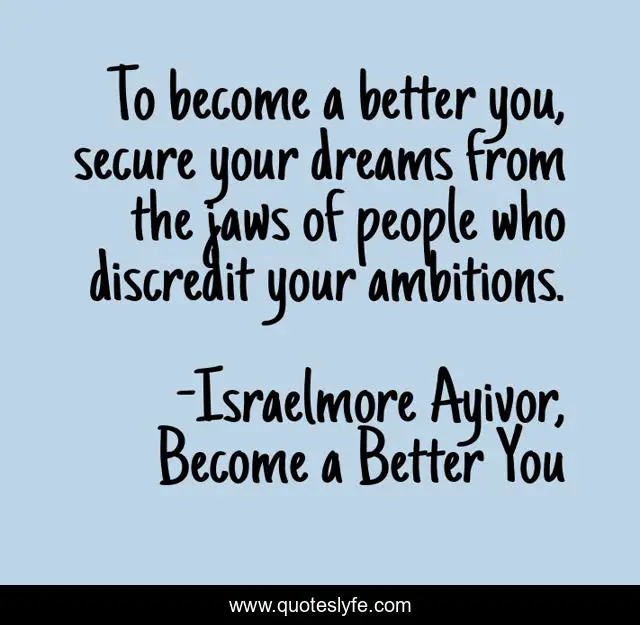 This page presents the quote "To become a better you, secure your dreams from the jaws of people who discredit your ambitions.". Author of this quote is Israelmore Ayivor, Become a Better You. This quote is about dream-big, negative-people, jaws, lips, secure, food-for-thought, better-you, ambitions, jaw,.