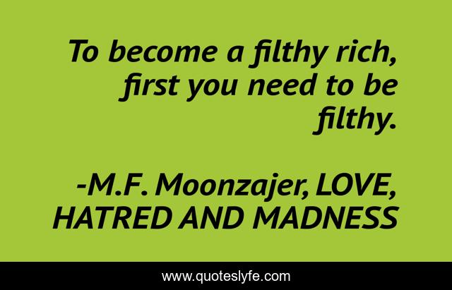 "M.F. Moonzajer, LOVE, HATRED AND MADNESS Quotes." Quoteslyfe.com, 2025. Tue. 09 Dec. 2025. <https://www.quoteslyfe.com/quote/To-become-a-filthy-rich-first-you-247836>.