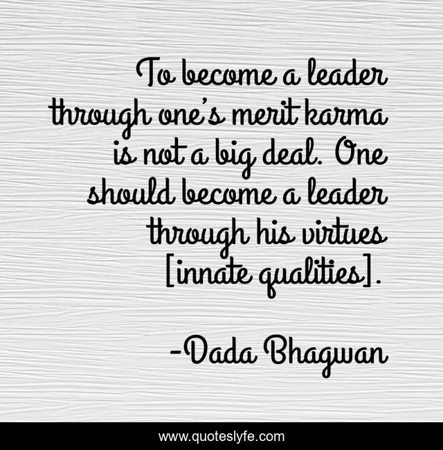 This page presents the quote "To become a leader through one’s merit karma is not a big deal. One should become a leader through his virtues [innate qualities].". Author of this quote is Dada Bhagwan. This quote is about deal, spiritual, leader, qualities, virtues,.