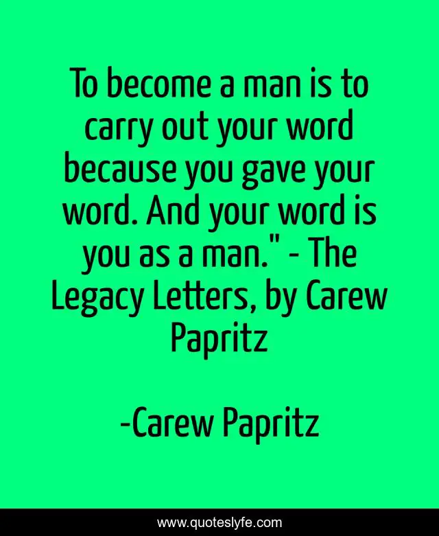 This page presents the quote "To become a man is to carry out your word because you gave your word. And your word is you as a man." - The Legacy Letters, by Carew Papritz". Author of this quote is Carew Papritz. This quote is about to-become-a-man, your-word, growing-up, life-lessons,.