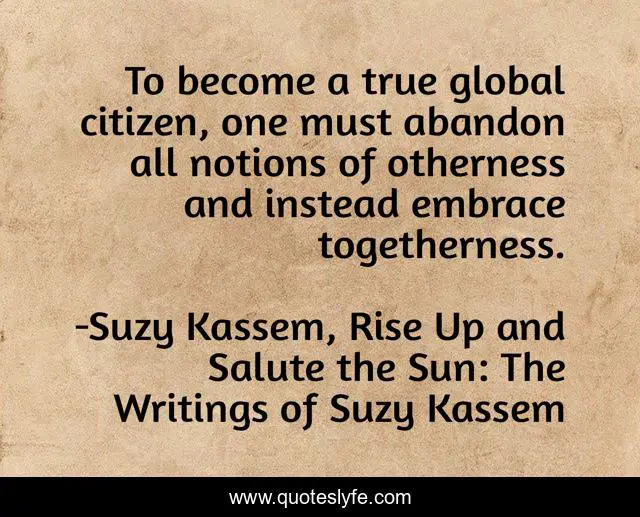 This page presents the quote "To become a true global citizen, one must abandon all notions of otherness and instead embrace togetherness.". Author of this quote is Suzy Kassem, Rise Up and Salute the Sun: The Writings of Suzy Kassem. This quote is about united, unify, otherness, differences, unity, same, human-family, world-peace, one-love,.