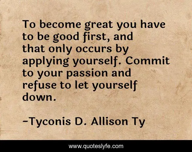 This page presents the quote "To become great you have to be good first, and that only occurs by applying yourself. Commit to your passion and refuse to let yourself down.". Author of this quote is Tyconis D. Allison Ty. This quote is about dedication, motivation, commitment, greatness,.