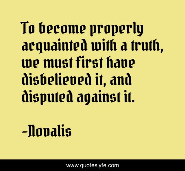 This page presents the quote "To become properly acquainted with a truth, we must first have disbelieved it, and disputed against it.". Author of this quote is Novalis. This quote is about become, first,.