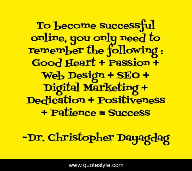 This page presents the quote "To become successful online, you only need to remember the following : Good Heart + Passion + Web Design + SEO + Digital Marketing + Dedication + Positiveness + Patience = Success". Author of this quote is Dr. Christopher Dayagdag. This quote is about positiveness, online-success, web-design, digital-marketing, patience, passion, inspirational, dedication, enthusiasm,.