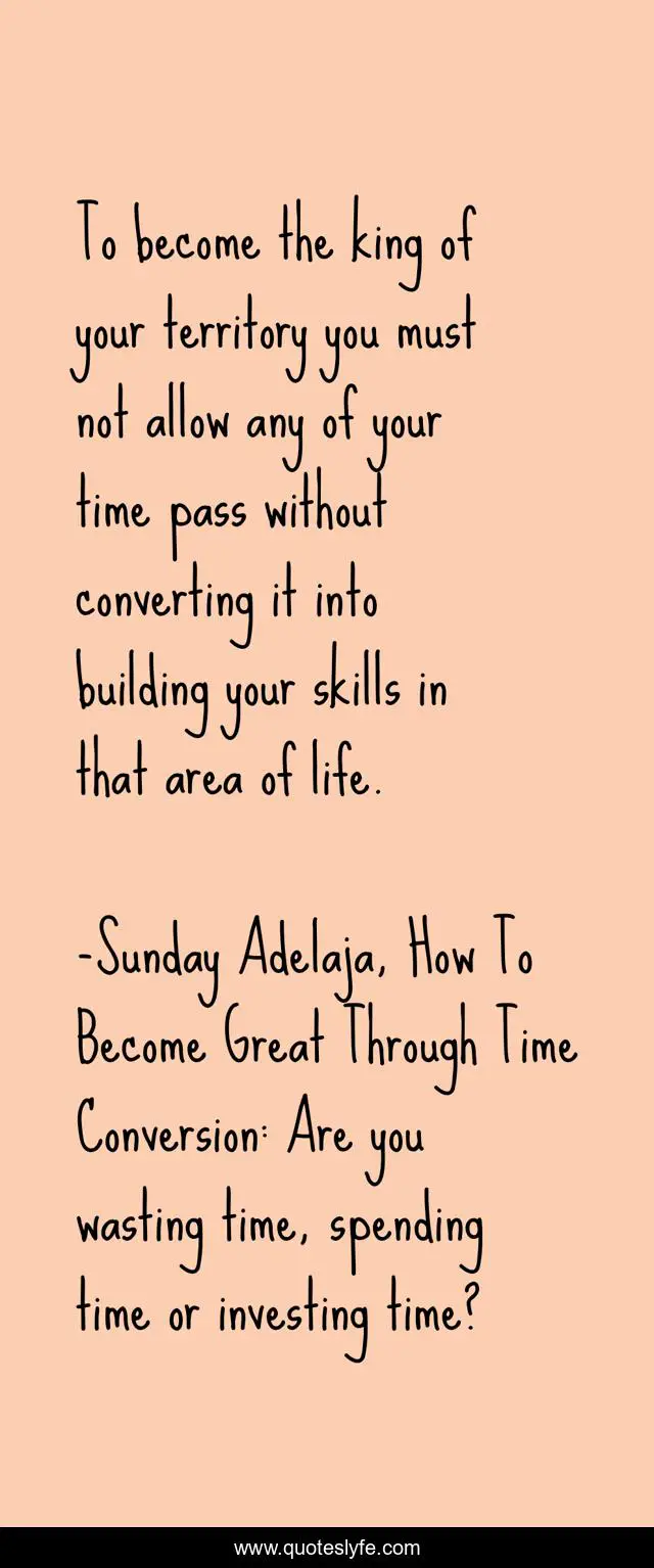 "Sunday Adelaja, How To Become Great Through Time Conversion: Are you wasting time, spending time or investing time? Quotes." Quoteslyfe.com, 2025. Fri. 05 Dec. 2025. <https://www.quoteslyfe.com/quote/To-become-the-king-of-your-territory-38926>.