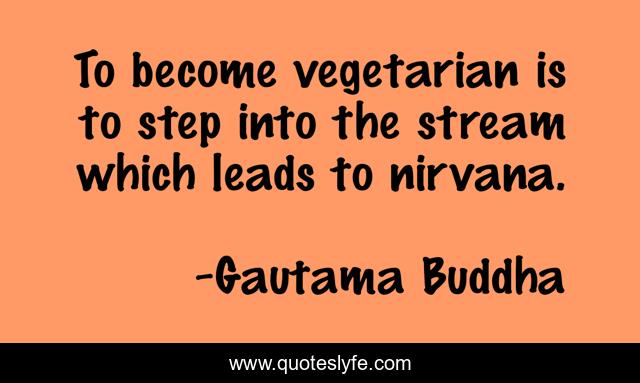 This page presents the quote "To become vegetarian is to step into the stream which leads to nirvana.". Author of this quote is Gautama Buddha. This quote is about life, love, nature, misattributed, vegan-vegetarian, affection,.