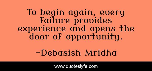 This page presents the quote "To begin again, every failure provides experience and opens the door of opportunity.". Author of this quote is Debasish Mridha. This quote is about failure, philosophy, debasish-mridha, experience, quotes, debasish-mridha-md, inspirational, enthusiasm, opportunity,.