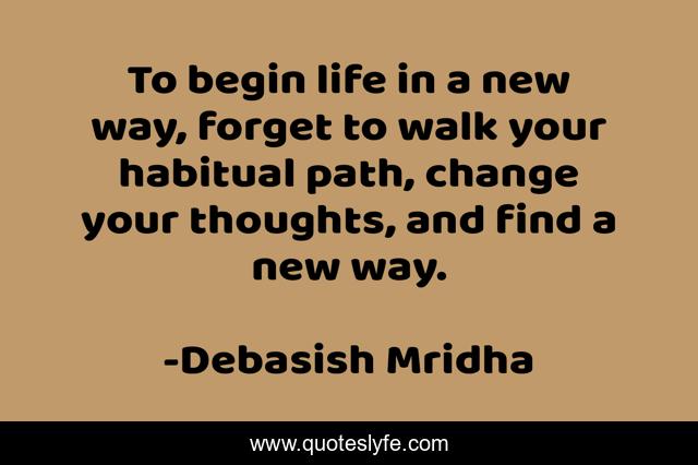 This page presents the quote "To begin life in a new way, forget to walk your habitual path, change your thoughts, and find a new way.". Author of this quote is Debasish Mridha. This quote is about find-a-new-way, change-your-thoughts, habitual-path, how-to-change-your-life, philosophy, debasish-mridha, new-life, quotes, debasish-mridha-md,.