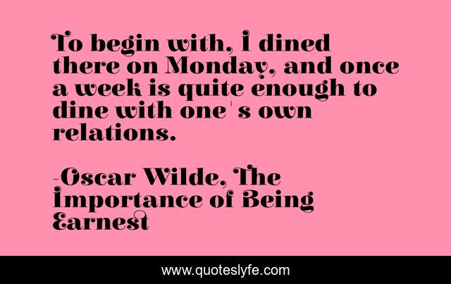 This page presents the quote "To begin with, I dined there on Monday, and once a week is quite enough to dine with one's own relations.". Author of this quote is Oscar Wilde, The Importance of Being Earnest. This quote is about dining, humor, family,.