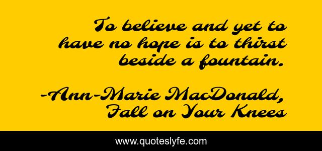 This page presents the quote "To believe and yet to have no hope is to thirst beside a fountain.". Author of this quote is Ann-Marie MacDonald, Fall on Your Knees. This quote is about belief, hope,.