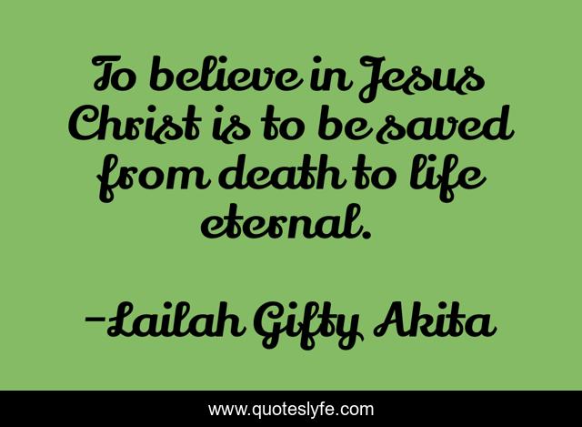 This page presents the quote "To believe in Jesus Christ is to be saved from death to life eternal.". Author of this quote is Lailah Gifty Akita. This quote is about jesus-christ, life, death, inspirational, enthusiasm, believe, saved-from-sin,.