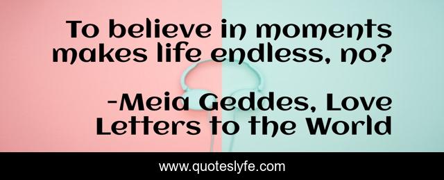 "Meia Geddes, Love Letters to the World Quotes." Quoteslyfe.com, 2025. Sat. 06 Dec. 2025. <https://www.quoteslyfe.com/quote/To-believe-in-moments-makes-life-endless-251374>.