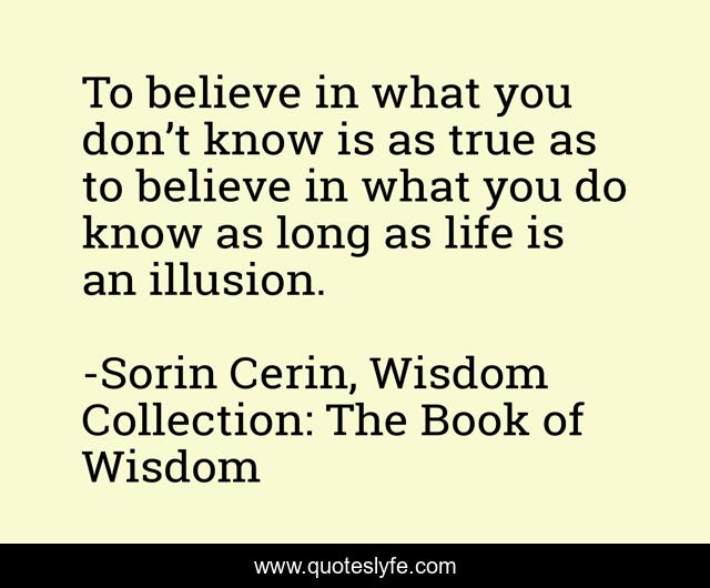 This page presents the quote "To believe in what you don’t know is as true as to believe in what you do know as long as life is an illusion.". Author of this quote is Sorin Cerin, Wisdom Collection: The Book of Wisdom. .