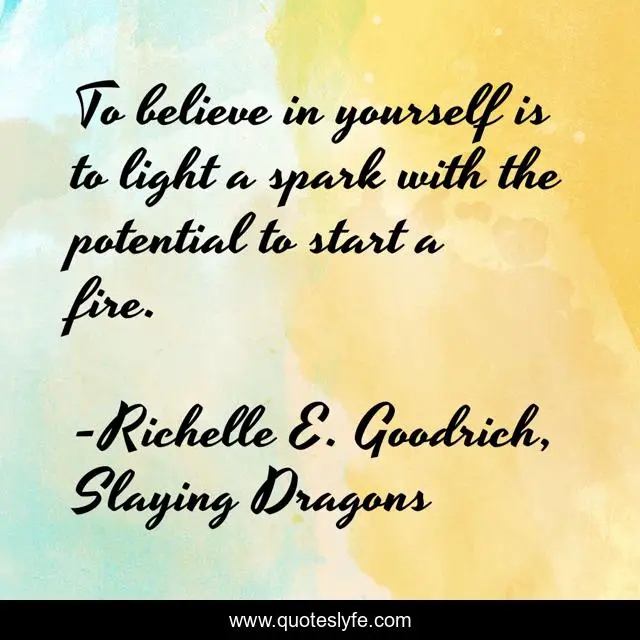 This page presents the quote "To believe in yourself is to light a spark with the potential to start a fire.". Author of this quote is Richelle E. Goodrich, Slaying Dragons. This quote is about self-confidence, believe-in-yourself, slaying-dragons, self-worth, potential, richelle, richelle-e-goodrich, richelle-goodrich, worth,.