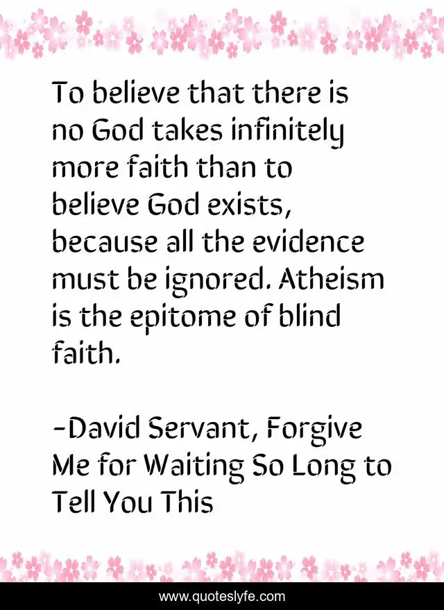 This page presents the quote "To believe that there is no God takes infinitely more faith than to believe God exists, because all the evidence must be ignored. Atheism is the epitome of blind faith.". Author of this quote is David Servant, Forgive Me for Waiting So Long to Tell You This. This quote is about atheism, god, blind-faith, christianity,.