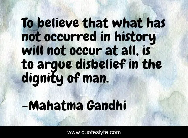 This page presents the quote "To believe that what has not occurred in history will not occur at all, is to argue disbelief in the dignity of man.". Author of this quote is Mahatma Gandhi. This quote is about dignity, man, faith, history,.