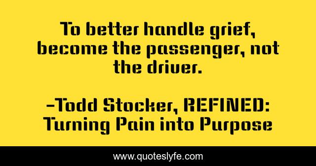 This page presents the quote "To better handle grief, become the passenger, not the driver.". Author of this quote is Todd Stocker, REFINED: Turning Pain into Purpose. This quote is about loss, confidence, pain, positive, motivational, grief, optimistic,.