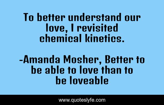 This page presents the quote "To better understand our love, I revisited chemical kinetics.". Author of this quote is Amanda Mosher, Better to be able to love than to be loveable. This quote is about humor, love, love-and-sayings, affection,.
