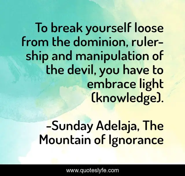 This page presents the quote "To break yourself loose from the dominion, ruler-ship and manipulation of the devil, you have to embrace light (knowledge).". Author of this quote is Sunday Adelaja, The Mountain of Ignorance. This quote is about mountain, life, devil, darkness, power, danger, god, break-loose, people,.