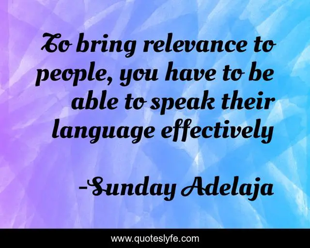 This page presents the quote "To bring relevance to people, you have to be able to speak their language effectively". Author of this quote is Sunday Adelaja. This quote is about impact, language-barrier, life, blessing, finance, effective, communication, work, language,.