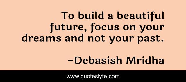 This page presents the quote "To build a beautiful future, focus on your dreams and not your past.". Author of this quote is Debasish Mridha. This quote is about philosophy, how-to-build-a-future, focus-on-your-dreams, debasish-mridha, future-vs-past, quotes, future, debasish-mridha-md, inspirational,.