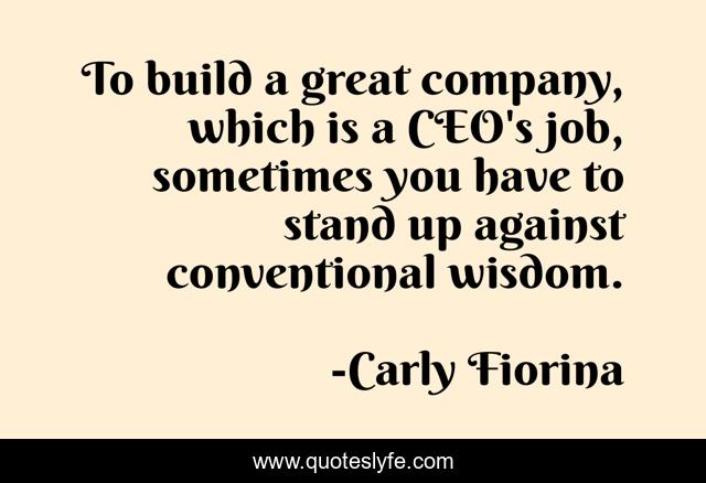 This page presents the quote "To build a great company, which is a CEO's job, sometimes you have to stand up against conventional wisdom.". Author of this quote is Carly Fiorina. This quote is about job, great, company,.