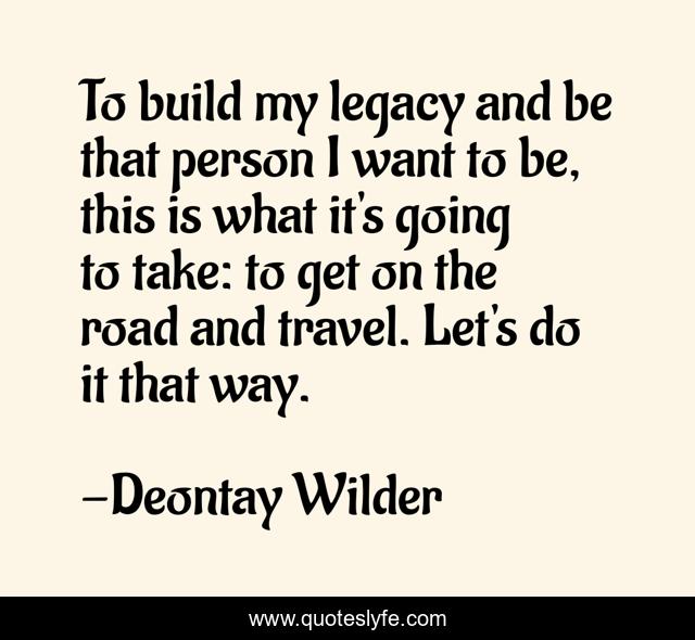 This page presents the quote "To build my legacy and be that person I want to be, this is what it's going to take: to get on the road and travel. Let's do it that way.". Author of this quote is Deontay Wilder. This quote is about legacy, road,.